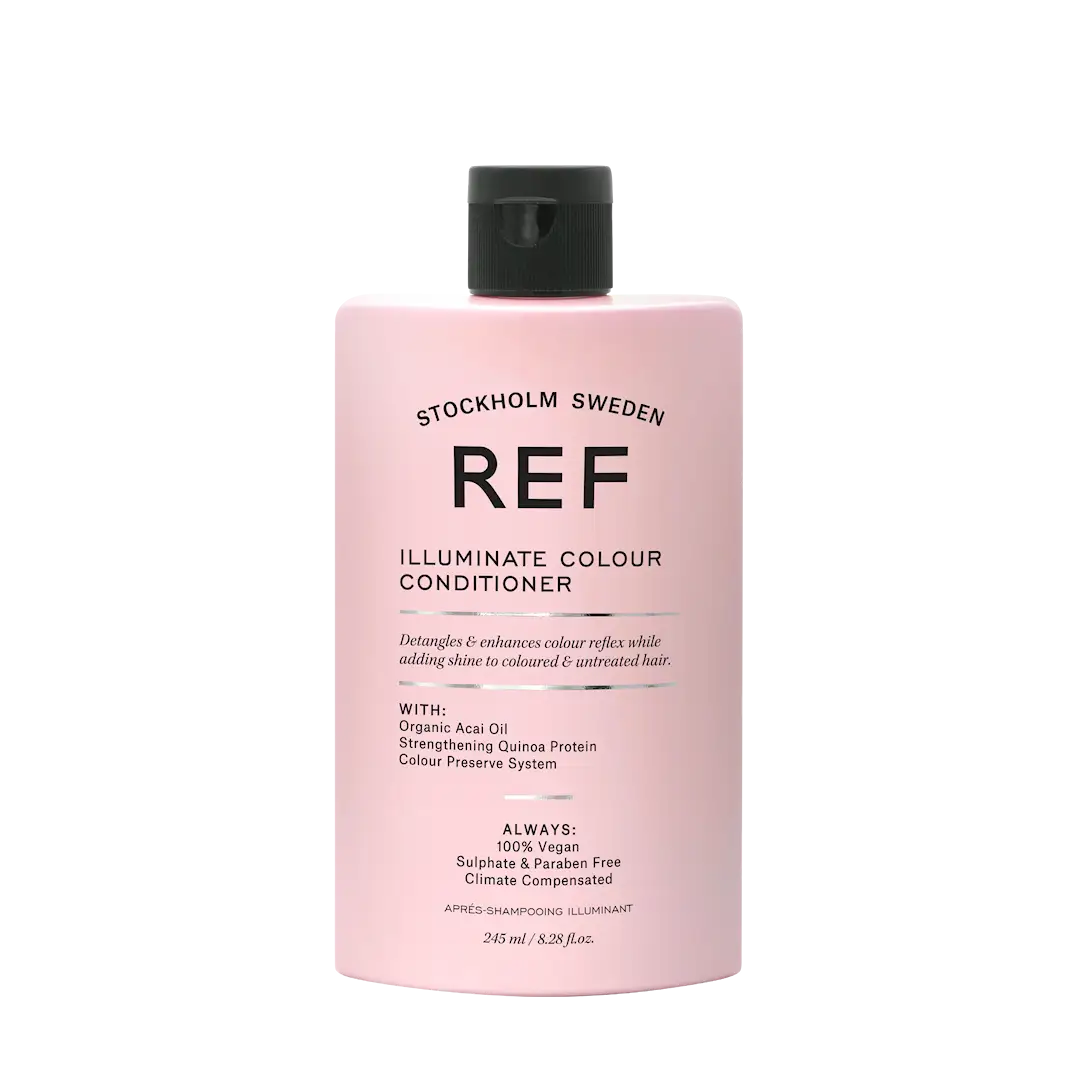REF Illuminate Colour Conditioner er en sulfatfri, vegansk balsam utviklet for å beskytte og forsterke hårfargen, samtidig som den tilfører intens glans og forbedrer hårets håndterbarhet. Den er ideell for alle hårtyper, spesielt fargebehandlet hår, og gir en silkemyk finish som fremhever hårfargens dybde og refleksjon.