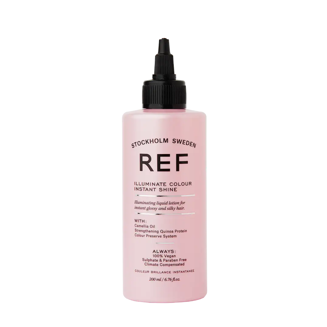 REF Illuminate Colour Instant Shine er en veldig lett leave-in lotion utviklet for å gi farget og naturlig hår en umiddelbar boost av glans, dybde og liv. Formelen er skreddersydd for profesjonell bruk, og gir øyeblikkelig visuell effekt: en speilblank overflate, forbedret fargereflektering og en silkemyk tekstur som holder seg.