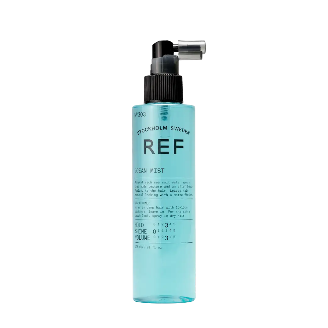 REF Ocean Mist N°303 er en saltvannsspray designet for å gi håret en naturlig, strandinspirert look med tekstur og volum. Den etterlater håret friskt og mykt, med en arbeidsbar kropp og en matt finish. Produktet er ideelt for å skape en avslappet og uanstrengt stil som etterligner effekten av en dag på stranden.