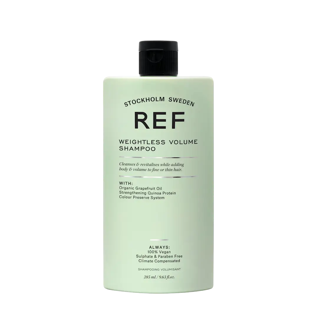 REF Weightless Volume Shampoo er en sulfatfri, vegansk sjampo utviklet for fint, tynt eller flatt hår. Formelen er lett, men effektiv. Den renser skånsomt og styrker hårfibrene uten å tilføre unødvendig tyngde. Resultatet er merkbart mer fylde, struktur og bevegelse. Ideelt som grunnlag for volumstyling og føning.